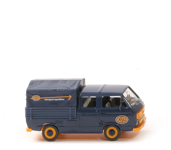Farbe Karosserie | "saphirblau" | Grill und Lüftergitter | melonengelb eingesetzt, Scheinwerfer gesilbert | Beschriftung Türen | ASG-Logo | weitere Bedruckung Front | VW-Emblem schwarz | Verglasung | klar | Inneneinrichtung | Lkr separiert | Farbe Inneneinrichtung | ca. betongrau | Chassis Farbe | melonengelb | Bodenprägung | neues WIKING-Logo, Germany | Pritsche | "saphirblau" | Bedruckung Rückleuchten | rot | Plane | "saphirblau" | Beschriftung Plane | "ASG, Transport-Spedition" ... (s. Foto) | Räder | 2-teilig | Felgen | melonengelb, VW-Felgen | Radkappen | Druck ca. "saphirblau" |