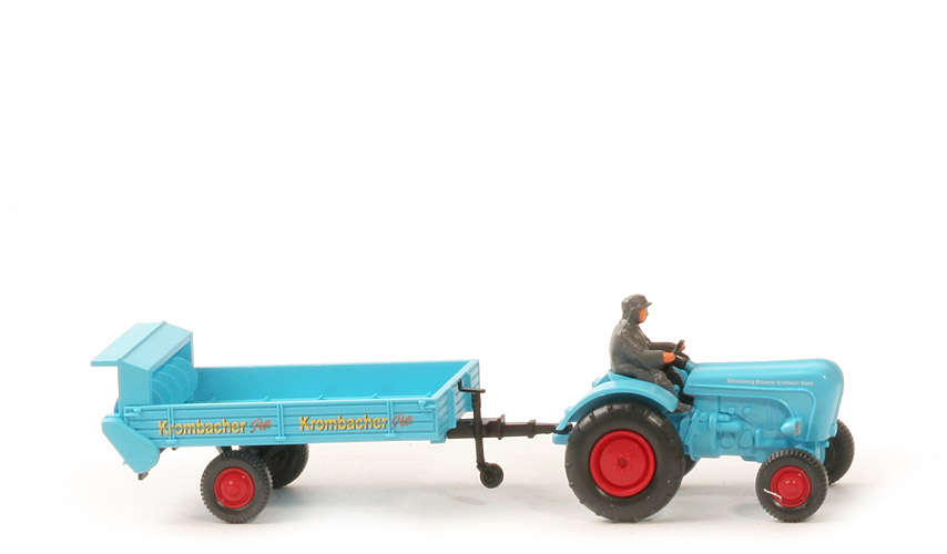 | Traktor | Aufbau | adriablau | Bodenprägung unter Vorderachse | spiegelverkehrte 2 | Verstärkung neben Fahrersitz | mit | Vorderachsportal | stark | Scheinwerfer | klein, silbern bemalt | Zughaken | dünn | Lenkrad | schwarz, 3 Speichen | Fahrer | ca. basa | Druck Haube seitlich | "Schadeberg Brauerei, Krombach, Westf." | Räder | fast schwarz | Felgen vorne | rot, ohne Radmuttern | Felgen hinten | rot, geschlossen | | Anhänger | Typ | Stalldung-Breitstreuer | Pritsche | adriablau | Bedruckung Pritsche | "Krombacher Pils" | Streuwerk | adriablau | Spindel | adriablau | Chassis | schwarz | Bodenprägung | neues WIKING-Logo | Stützrad | schwarz | Räder | fast schwarz | Felgen | rot, ohne Radmuttern |