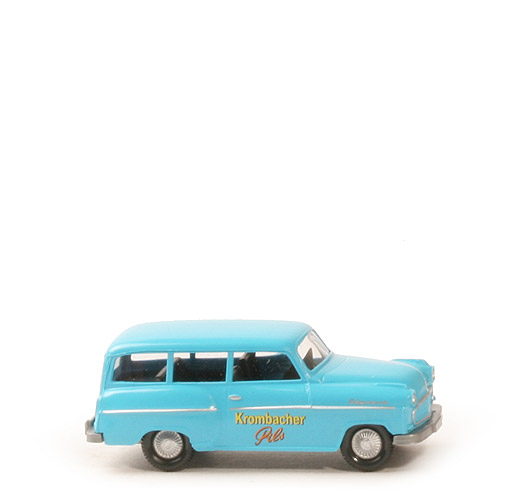 Sondermodell für Krombacher. Das Grundmodell gab es zunächst nur als nicht realisierte Vorserie. War für 1981 angekündigt und ging dann erst 2006 in Serie. Modell in besonders schöner Bedruckung: vorne Opel Emblem silbern, Kotflügel vorne seitlich mit "Olympia", Zierleisten und die 3 Türgriffe in silber. |