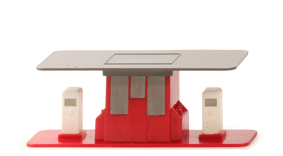 Dach Typ | eckig, glatt | Dach Farbe | basaltgrau | Gebäude Typ | unverglast | Gebäude Farbe | rot | Fenster Bemalung | silbern | Öldosen | integriert | Zapfsäulen Typ | offen (GK: "hohl") | Zapfsäulen Farbe | weiß | Zapfsäulen Bemalung | Anzeigefeld ca. silbergrau | Bodenplatte Farbe | rot | Bodenplatte Oberseite | glatt | Bodenplatte Unterseite | glatt | Bodenprägung | ohne |