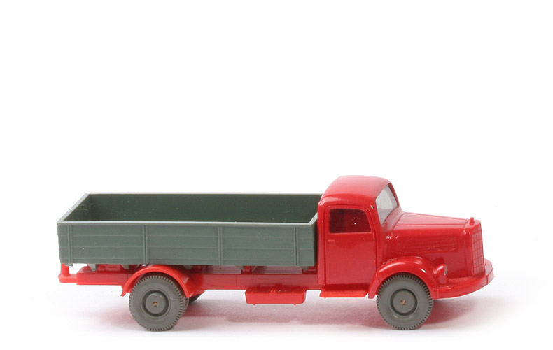 Farbe Kabine | rot | Version Kabine | mit Schlitz hinter Nrn-Schild | Blinker | ohne | Verglasung | getönt | Blinker | ohne | Bemalung | Scheinwerfer, Stoßstange | Chassis Farbe | orangerot | Chassis Art | Version 3b | Achshalterungen | offen | Chassis Bodenprägung | WM (ohne Kreis) und Made in .. | Zughaken | integriert | Rückleuchten am Chassis | mit | Pritsche Art | Normpritsche | Pritschenseiten | waagerechte Gravuren | Rückleuchten | bündig an Rückwand | Kennzeichen | einteilig | Pritsche Farbe | dunkelresedagrün | Pritscheneinlage | silbern | Bemalung Rückleuchten | rot | Bemalung Kennzeichen | ohne | Räder | 11 mm, glatt, hellgrau |