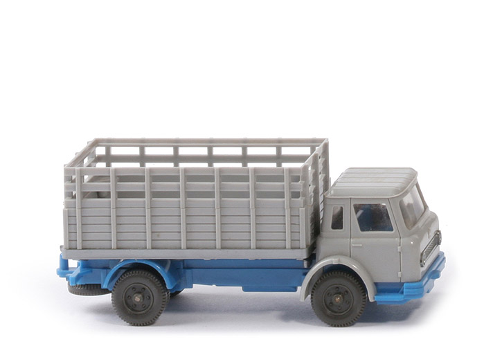 Farbe Kabine | silbergrau | Dachlüfter | ohne | Inneneinrichtung | himmelblau | Verglasung | klar | Chassis | himmelblau | Zughaken | ins Chassis integriert | Reserverad | am Heck unter Chassis | Pritsche | silbern | unterer Aufbau | geschlossen, verklebt | Farbe unterer Aufbau | silbergrau | oberer Aufbau | durchbrochen, gesteckt | Typ oberer Aufbau | mit Steckhalterungen | Farbe oberer Aufbau | silbergrau | Bemalung Heck | Rückleuchten der Rücklichtstangen rot | Räder | 11mm, 6-Loch einteilig |