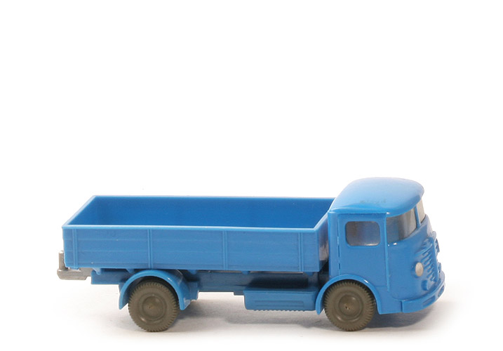 Kabine | himmelblau | Türgriffe | schräg | Inneneinrichtung | ohne | Blinker | ohne | Bemalung Front | Scheinwerfer silbern | Chassis Farbe | lichtblau | Bodenprägung | ohne | Rücklichtstangen | ohne | Zughaken | silber, eingesetzt | Befestigungspunkt Pritsche | ohne | Pritsche Ausführung | alt, Seiten Struktur | Pritsche Farbe | himmelblau | Pritscheneinlage | ohne | Bemalung Heck | Rücklichter rot | Plane | ohne | Räder | 10mm, ältere Ausführung |