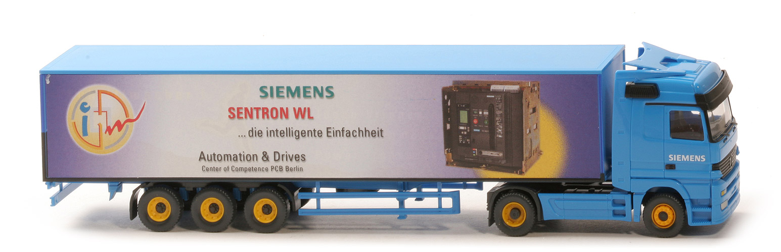 Dieses Modell ist in den Katalogen nicht erfasst - es ist ähnlich dem letzten im GK 2003 gelisteten Werbemodell Siemens "Schrittmacher". Die Türen der Kabine tragen den Schriftzug "Siemens" in weiß. Die Kofferseiten haben die gezeigte Beschriftung in Form eines flächigen Aufklebers. Die Werbeeinlage entspricht in ihrer Gestaltung (nicht in der Größe) der einer seltenen Version des Grove-Krans - siehe letztes Bild. |