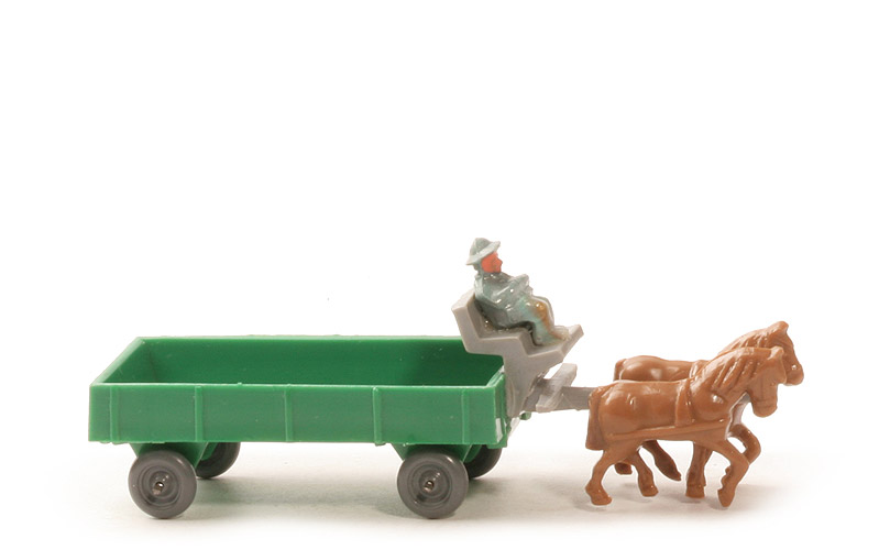 Räder | Drahtachser | Pritschentyp | ohne Querverbretterung | Farbe Pritsche | grün | Deichselrest | mit | Pritschenboden | mit Struktur | Zughaken | integriert, nach unten | Deichsel/Kutschbock | silbergrau | Quersteg Deichsel | mit | Farbe linkes Pferd | ockerbraun | Farbe rechtes Pferd | ockerbraun | Kutscher Typ | Hut | Kutscher Farbe | ca. helladriablau misch | Kutscher Bemalung | Gesicht, Hände | Räder | staubgrau |