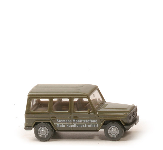 | Farbe Karosserie | hellolivgrün | | Hecktür | 2-teilig | | Reserverad | ohne | | Grill | Teil des Chassis | | Verglasung | klar | | Dach | separat aufgesetzt | | Inneneinrichtung | ca. graubeige | | Chassis Farbe | basaltgrau | | Bodenprägung | WIKING - Berlin-W | | Zughaken | ohne | | Druck Fahrerseite | "Siemens Mobiltelefone", "Mehr Handlungsfreiheit" | | Druck Beifahrerseite | "Siemens Mobiltelefone", "Mehr Handlungsfreiheit" | | Räder | 9 mm | | Radkappen | silbern |
