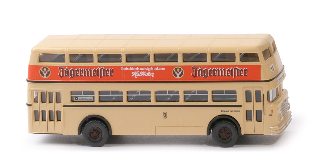 Karosserie Farbe | hellbeige | Karosserie Typ | Einstieg hinten geschlossen | Verglasung | klar | Fahrer Farbe | ca. basaltgrau | Fahrer Typ | Standardbusfahrer | Fahrer Bemalung | Gesicht | Lenkrad | separat, schwarz | Sitze Farbe | ca. patinagrün | hintere Fahrgastraumbegrenzung | ohne | Treppe hinten | ohne | Chassis Farbe | schwarz | Kardanelement Farbe | schwarz | Version Chassis | ohne kreisrunde Verstärkung | Bodenprägung | neues WIKING-Logo | Werbebeschriftung | Jägermeister ... (s. Foto) | Zielbeschriftung vorne | 13 , Alt-Heiligensee | Stadtwappen | schwarz | Art der Beschriftung | Druck | weitere Bedruckung vorne | Scheinwerfer, Büssing-Spinne, silber, ... | weitere Bedruckung hinten | 2 Rückleuchten rot, Jägermeister Logo. ... | Räder Typ | 12 mm, Profil grob | Felgen | Trilex, ca. schokobraun |