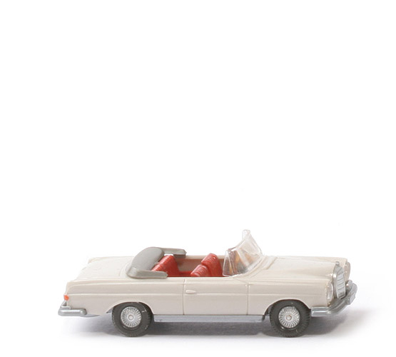 Farbe Karosserie | braunweiß | Armaturenbrett | ohne | Windschutzscheibe | klar, eingeklebt | Scheinwerfer | klar, eingeklebt | Fläche hinter Scheinwerfern | silbern bemalt | Grill | silbern bemalt, eingesetzt, mit Stern | Persenning | ca. betongrau | Sitze Farbe | helles hellbraunrot | Sitzflächen | fein strukturiert | Lenkrad | separat eingesetzt, beige | Fußraumbegrenzung | ohne | Chassis Farbe | silbern | Bodenprägung | Mercedes 300 SE, Made in Germany | Bemalung Rückleuchten | orange | Räder | Riffelkappe gesilbert |
