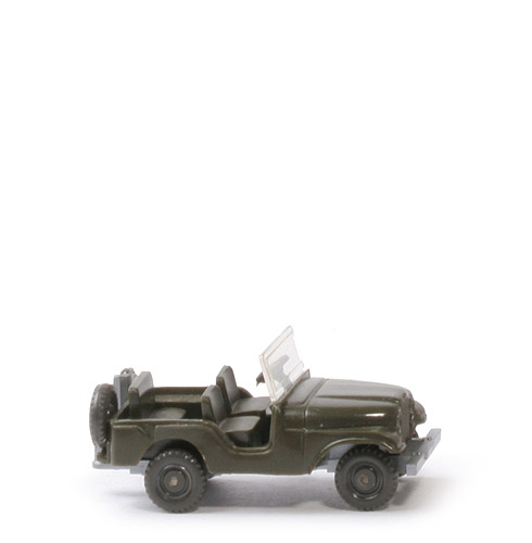 Farbe Karosserie | olivgrün | Frontscheibe | klar transparent, eingeklebt | Lenkrad | anthrazit, 3-speichig | Sitze vorne | olivgrün | Sitzbank hinten | olivgrün | Chassis Farbe | silbern | Verstärkung vor Hinterachse | mit | Zughaken | integriert | Bodenprägung | WM, Germany | Reserverad | rechts angeklebt | Benzinkanister | links angeklebt, silbern | Bemalung Scheinwerfer | ohne | Bemalung Rückleuchten | ohne | Räder Typ | 8 mm, grobes Profil | Räder Farbe | anthrazit |