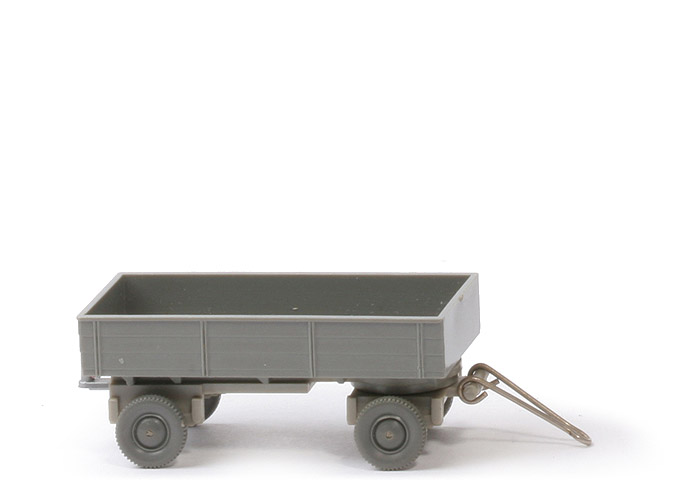 | Pritsche | Pritsche Farbe | betongrau | Pritschenseiten | mit Struktur | Pritscheneinlage | ohne | Kennzeichen hinten | zweiteilig | | Chassis | Chassis Variante | Typ 2 | Chassis Farbe | hellolivgrau | Achshalterungen | offen | Drehschemel | eingesteckt | Bodenprägung Drehschemel | WM | Bodenprägung Chassis | ohne | Zughaken | silbern, Typ LKW, unter Chassis geklebt | | weitere Details | Deichsel | Metall | Bemalung Rückleuchten | ohne | Bemalung Kennzeichen | ohne | Räder | 10 mm, staubgrau, ältere Ausführung |