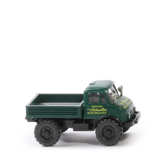 Farbe Kabine | "moosgrün" | Verglasung | klar | Inneneinrichtung | schwarz, Sitze Struktur | Lenkrad | eingesetzt, schwarz | Frontbeschriftung | "Spedition Friedrich Schulze Berlin Mariendorf" | Türdruck | "Spedition Friedrich Schulze Berlin Mariendorf" | zusätzliche Scheinwerfer | ca. betongrau, gesilbert | Bedruckung Grill | Scheinwerfer, MB-Stern, Zierlinie silbern | Chassis Farbe | schwarz | Bodenprägung | 370, neues WIKING-Logo | Kardanelement Farbe | schwarz | Reserverad | über Chassis | Pritsche | "moosgrün" | Pritscheneinlage Typ | 6 Längsstreifen und trapezförmige Gravur | Pritscheneinlage Farbe | silbern | Räder | 12 mm, grobstollig, separate Felgen | Felgen | 6-Loch, schwarz |