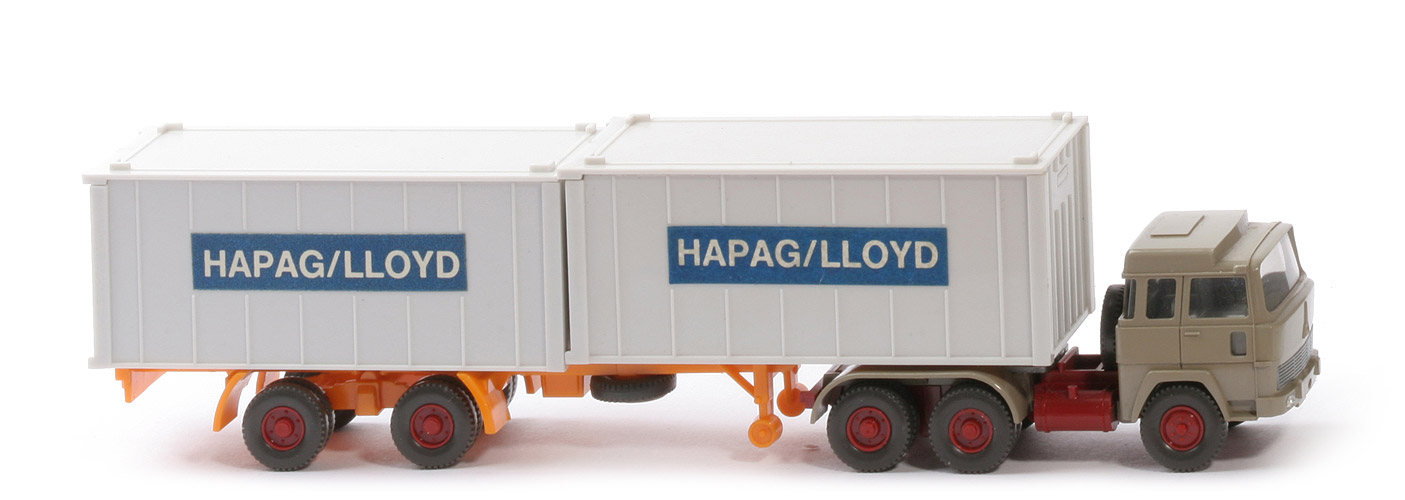 | Zugmaschine | Kabine oben | olivgrau | Kabine unten | olivgrau | Verglasung | klar | Inneneinrichtung | ca. platingrau | Lenkrad | ohne | Grill | silber | Chassis | hellbraunrot | Radlauf hinten | olivgrau | Sattelpfanne | neu, für starken Bolzen | Reserverad | hinter Kabine, mit Felgeneinsatz | Räder | Profil grob | Felgen | hellbraunrot | | Container | Art | 2 x 20 ft gerippt | Farbe | altweiß | Beschriftung Container | "Hapag-Lloyd" | Beschriftung Art | Papieraufkleber über 5 Felder | | Auflieger | Farbe | glasiges orangegelb (Werbe) | Unterfahrschutz | ohne | Königsbolzen | stark | Räder | Profil grob | Felgen | hellbraunrot |