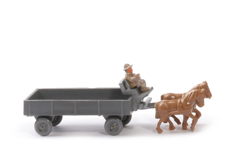 Räder | Drahtachser | Pritschentyp | ohne Querverbretterung | Farbe Pritsche | basaltgrau | Deichselrest | ohne | Pritschenboden | mit Struktur | Zughaken | integriert, nach unten | Deichsel/Kutschbock | silbern | Quersteg Deichsel | mit | Farbe linkes Pferd | ockerbraun | Farbe rechtes Pferd | ockerbraun | Kutscher Typ | Hut | Kutscher Farbe | misch graubeige | Kutscher Bemalung | Gesicht, Hände | Räder | ca. staubgrau |