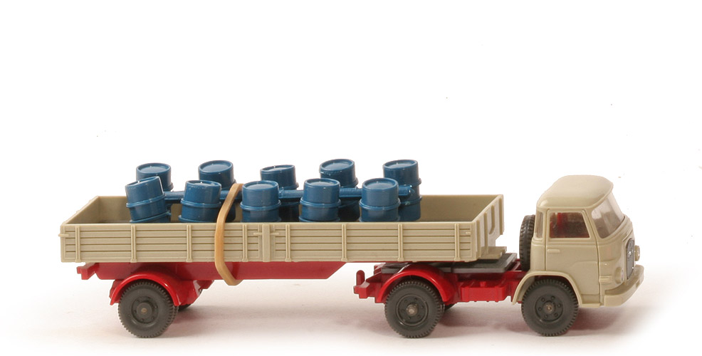 | Zugmaschine | Kabine | hellgelbgrau | Verglasung | klar | Inneneinrichtung | weinrot | Grill | silbern | Farbe Chassis | rot | Bemalung | Scheinwerfer silbern | Sattelpfanne | neu, für dünnen Bolzen | Bodenprägung | WM Germany | Reserverad | hinter Kabine | Räder | 11mm 6 Loch | | Auflieger | Pritsche Art | Holzpritsche | Pritsche Farbe | hellgelbgrau | Chassis | rot | Bodenprägung | Wiking/Germany | Königsbolzen | dünn | Pritscheneinlage | basaltgrau | Ladung | 2x 10 Öltonnenhäften am Spritzling | Farbe Ladung | capriblau | Räder | 11mm 6 Loch |