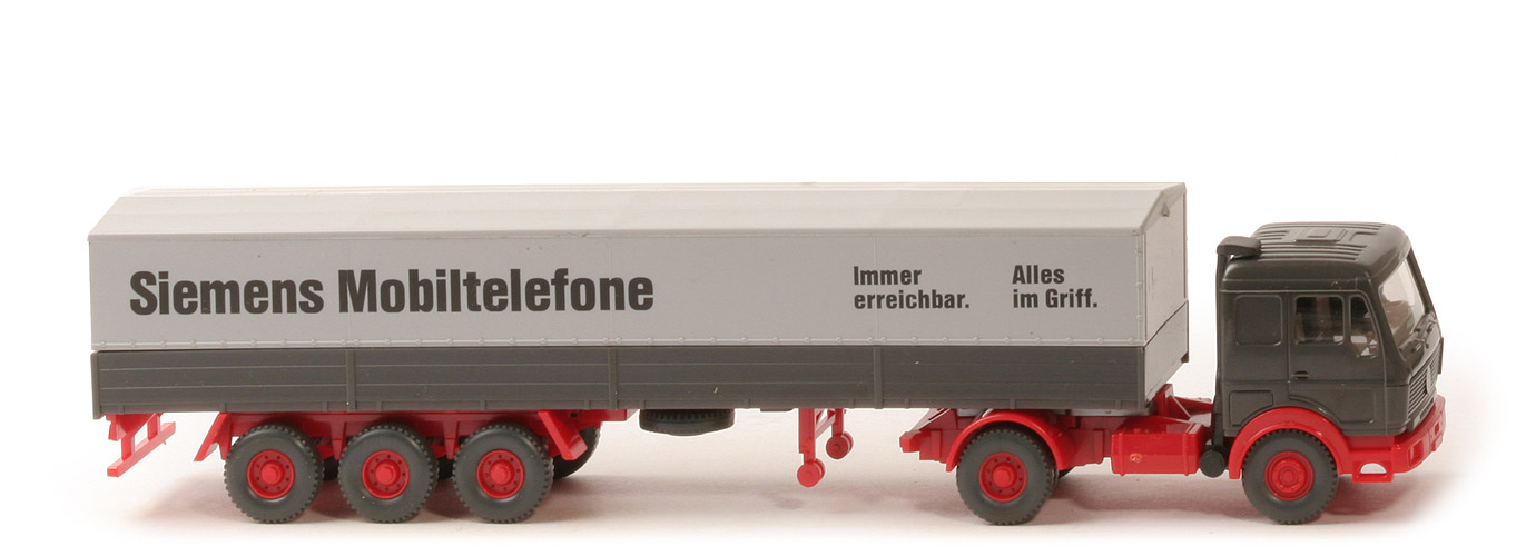 | Zugmaschine | Kabine Farbe | anthrazit | hintere Seitenfenster | geschlossen | Scheibenwischer | mit | Heckfenster | geschlossen | eingesetzter Grill | schwarz, mit MB-Stern, ohne Streifen | Inneneinrichtung | ca. graubeige, Lenkrad integriert | Ansaugstutzen | schwarz, hinter Kabinenrückwand | Stoßstange | rot | Chassis | rot, BP WIKING | Radlauf hinten | rot | Räder | 12 mm, Profil grob | Felgen | 8-Loch, rot | | Auflieger | Art | 4-fach-Teilung | Farbe Pritsche | anthrazit | Beschriftung Pritsche | ohne | Pritsche Bodenprägung | Wiking, Berlin-W | Chassis | rot | Pritscheneinlage | Pappe silbern | Plane | silbergrau | Beschriftung Seite | Siemens mobiltelefone ... (s. Foto) | Beschriftung Heck | Siemens mobiltelefone | Dreiachsaggregat Farbe | rot | Dreiachsaggregat Typ | eingesteckt, Klipsachsen | Hydraulikstütze | rot | Räder | 12 mm, Profil grob | Felgen | 8-Loch, rot |