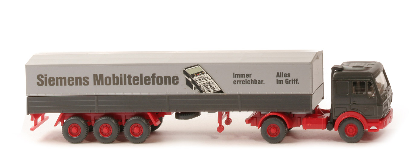 | Zugmaschine | Kabine Farbe | anthrazit | hintere Seitenfenster | geschlossen | Scheibenwischer | mit | Heckfenster | geschlossen | eingesetzter Grill | schwarz, mit MB-Stern, ohne Streifen | Inneneinrichtung | ca. graubeige, Lenkrad integriert | Ansaugstutzen | schwarz, hinter Kabinenrückwand | Stoßstange | rot | Chassis | rot, BP WIKING | Radlauf hinten | rot | Räder | 12 mm, Profil grob | Felgen | 8-Loch, rot | | Auflieger | Art | 4-fach-Teilung | Farbe Pritsche | anthrazit | Beschriftung Pritsche | ohne | Pritsche Bodenprägung | Wiking, Berlin-W | Chassis | rot | Pritscheneinlage | Pappe silbern | Plane | silbergrau | Beschriftung Seite | Siemens mobiltelefone ... (s. Foto) mit Abziehbild Telefon | Beschriftung Heck | Siemens mobiltelefone | Dreiachsaggregat Farbe | rot | Dreiachsaggregat Typ | eingesteckt, Klipsachsen | Hydraulikstütze | rot | Räder | 12 mm, Profil grob | Felgen | 8-Loch, rot |
