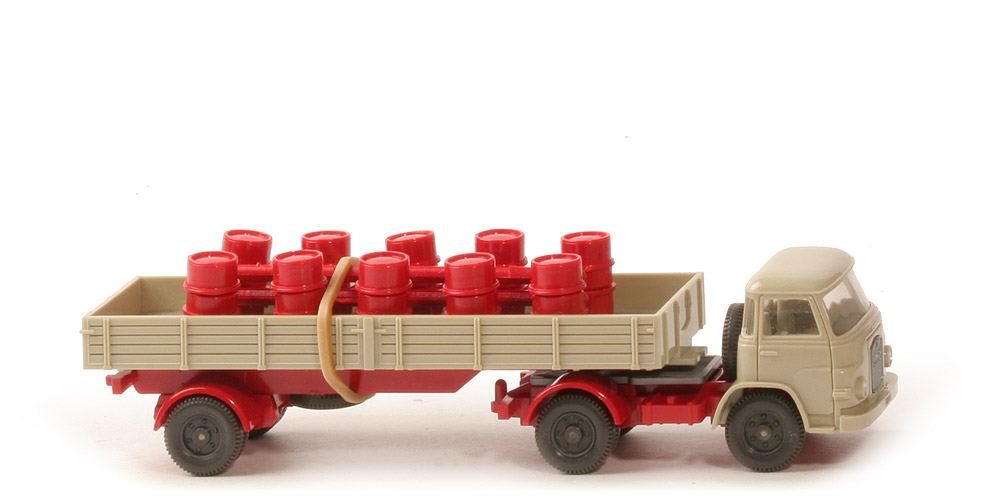 | Zugmaschine | Kabine | hellgelbgrau | Verglasung | klar | Inneneinrichtung | silbergrau | Grill | silbern | Farbe Chassis | rot | Bemalung | Scheinwerfer silbern | Sattelpfanne | neu, für dünnen Bolzen | Bodenprägung | WM Germany | Reserverad | hinter Kabine | Räder | 11mm 6 Loch, Profil fein | | Auflieger | Pritsche Art | Holzpritsche | Pritsche Farbe | hellgelbgrau | Chassis | rot | Bodenprägung | Wiking/Germany | Königsbolzen | dünn | Pritscheneinlage | hellgelbgrau | Ladung | 2x 10 Öltonnenhälften am Spritzling | Farbe Ladung | (dunkles) rot | Räder | 11mm 6 Loch, Profil fein |