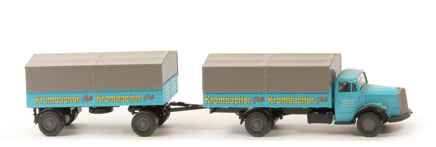 | Zugwagen | Fahrerhaus | adriablau | Warndreieck auf Dach | ohne | Verglasung | klar | Inneneinrichtung | schwarz | Lenkrad | separiert | Türdruck | "Schadeberg Brauerei, Krombach, Westf." | Grill | silbern eingesetzt | Scheinwerfer | silbern eingesetzt | Kotflügel | schwarz | Chassis | schwarz | Kardanelement | schwarz | Bodenprägung | neues WIKING-Logo | Reserverad | unter Chassis | Kotflügel hinten | schwarz | Pritsche | adriablau, Druck 2x "Krombacher Pils" (s. Foto) | Plane | platingrau | | Anhänger | Pritsche | adriablau, Druck 2x "Krombacher Pils" (s. Foto) | Pritscheneinlage | ohne | Plane | platingrau | Chassis | schwarz, filigran, mit Zughaken | Drehschemel | schwarz | Bodenprägung | ohne | Reserverad | unter Chassis geklebt | Deichsel | schwarz Kunststoff, ohne Bremsstange | | Räder | Typ | 12 mm, 2-teilig | Felgen | 6-Loch, umbragrau |