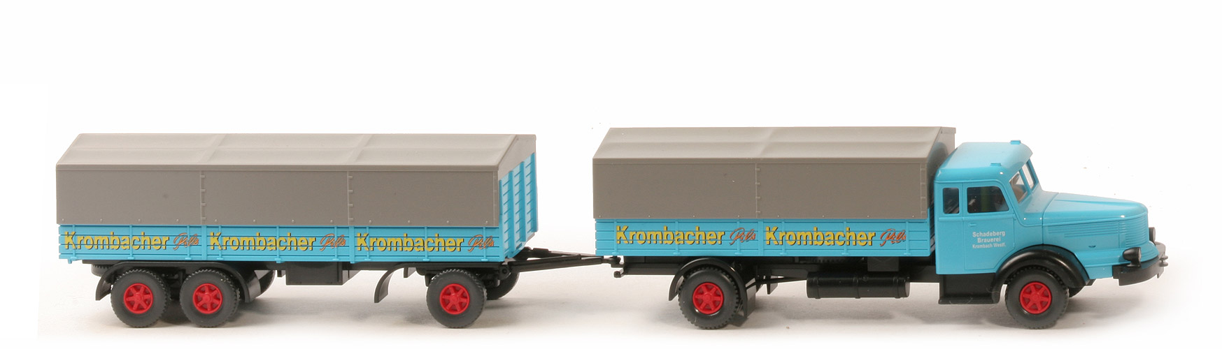 | | Zugwagen | | Kabine | adriablau | | Verglasung | klar | | Inneneinrichtung | schwarz, Lkr separiert | | Bedruckung Scheinwerfer | silber | | Bedruckung Türen | "Schadeberg Brauerei, Krombach, Westf." | | Chassis Farbe | schwarz | | Kardaneinsatz | schwarz | | Bodenprägung | neues WIKING-Logo | | Zughaken | klein | | Reserverad | mittig auf Chassis | | Bedruckung Rückleuchten | ohne | | Pritsche | adriablau | | Bedruckung Pritsche | 2x "Krombacher Pils" | | Pritscheneinlage | ohne | | Plane | geschlossen, dunkles silbergrau | | | Anhänger | | Typ | neuer Dreiachs-Anhänger | | Pritsche | adriablau | | Druck Pritsche | 3x "Krombacher Pils" | | Pritscheneinlage | ohne | | Chassis | schwarz | | Bodenprägung Chassis | neues WIKING-Logo, GERMANY | | Fixierung Drehschemel | per Weichzapfen | | Plane | geschlossen, dunkles silbergrau | | | Räder | | Typ | 12mm, Felgen eingesetzt | | Felgen | Trilex, rot |