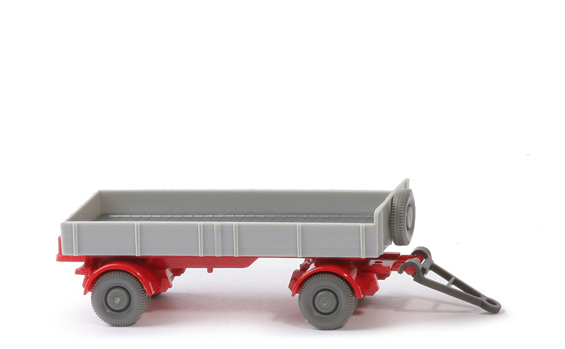 Dies ist der seltene Anhänger mit der frühen flachen Henschel-Pritsche. Die Stirnwand ist erhöht. Die Pritschenseiten verjüngen sich nach unten in einer 4-fachen Abtreppung der Pritschenverbretterung. Mit diesen Rädern nicht im GK. |
