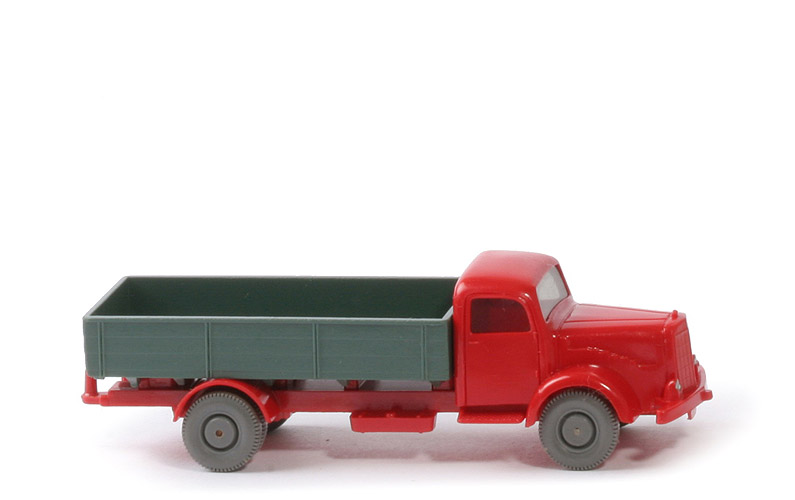 Farbe Kabine | rot | Version Kabine | mit Schlitz hinter Nrn-Schild | Blinker | ohne | Verglasung | getönt | Bemalung | Scheinwerfer, Stoßstange | Chassis Farbe | rot | Chassis Art | Version 3b | Achshalterungen | offen | Chassis Bodenprägung | WM (ohne Kreis) und Made in .. | Zughaken | integriert | Rückleuchten am Chassis | mit | Pritsche Art | Normpritsche | Pritschenseiten | waagerechte Gravuren | Rückleuchten | bündig an Rückwand | Kennzeichen | einteilig | Pritsche Farbe | dunkelresedagrün | Pritscheneinlage | ohne | Bemalung Rückleuchten | mit | Bemalung Kennzeichen | ohne | Räder | 11mm, glatt, hellgrau |