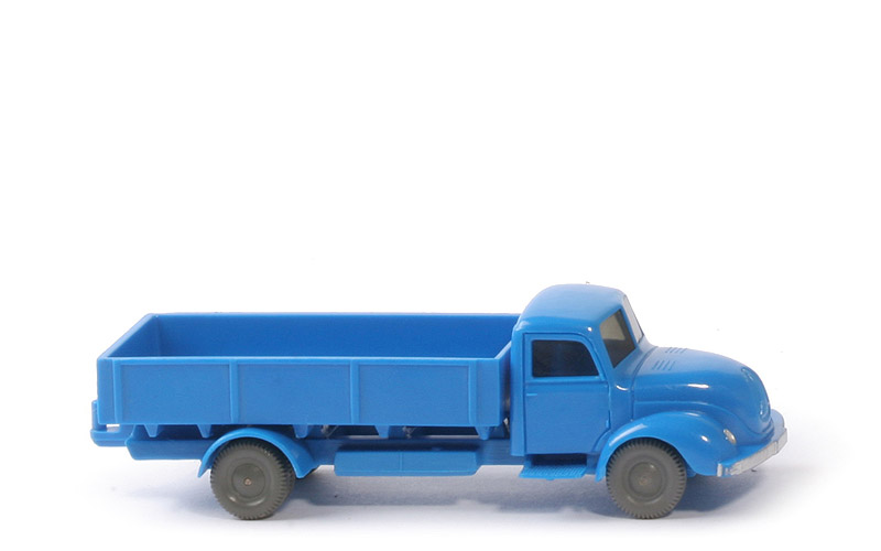 Farbe Kabine | himmelblau | Version Kabine | Typ 4 | Stoßstange | gerade | Kabinenboden | mit Schlitz | Blinker | ohne | Verglasung | getönt | Bemalung | Scheinwerfer, Stoßstange | Chassis Farbe | himmelblau | Version Chassis | Version 1c | Achshalterungen | geschlossen | Chassis Bodenprägung | WM im Kreis | Zughaken | Teil der Pritsche | Rückleuchten am Chassis | ohne | Pritsche Art | Normpritsche | Pritschenseiten | glatt | Rückleuchten | ohne | Pritsche Farbe | himmelblau | Pritscheneinlage | ohne | Bemalung Kennzeichen | silbern | Räder | 10 mm, ältere Ausführung |