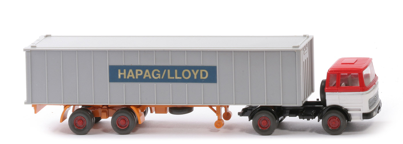 | Zugmaschine | Kabine oben | rot | Kabine unten | weiß | Streifen | mit | Verglasung | klar | Inneneinrichtung | ca. lichtgrau | Lenkrad | ohne | Grill | silbern | Stoßstange, Radlauf vorn | schwarz | Chassistyp | alt | Chassisfarbe | schwarz | Radlauf hinten | schwarz | Reserverad | hinter Kabine | Sattelpfanne | neu, für dünnen Bolzen | Räder | 12mm, Profil fein | Felgen | hellbraunrot | | Container | Art | 1 x 40 ft gerippt | Dach | silbergrau | Korpus | silbergrau | Türen | silbergrau | Unterkante | schmal | Beschriftung | Hapag-Lloyd (s. Foto) | Beschriftung Grösse | 7 Felder, Papieraufkleber | | Auflieger | Farbe | gelborange (Werbe) | Unterfahrschutz | ohne | Königsbolzen | dünn | Räder | 12mm, Profil fein | Felgen | hellbraunrot |