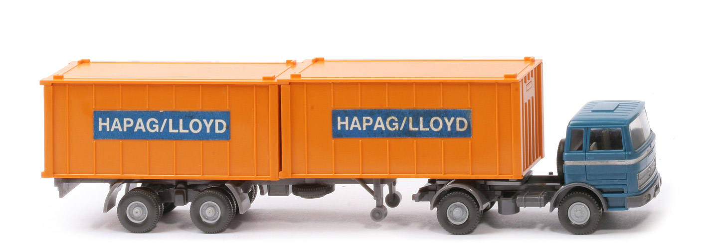 | Zugmaschine | Kabine oben | azurblau | Kabine unten | azurblau | Streifen | mit | Verglasung | klar | Inneneinrichtung | ca. lichtgrau | Lenkrad | ohne | Grill | silbern | Stoßstange, Radlauf vorn | basaltgrau | Chassistyp | neu | Chassisfarbe | basaltgrau | Radlauf hinten | basaltgrau | Reserverad | hinter Kabine | Sattelpfanne | neu, für dünnen Bolzen | Räder | 12mm, Profil grob | Felgen | silbergrau | | Container | Art | 2 x 20 ft gerippt | Dach | gelborange | Korpus | gelborange | Türen | gelborange | Beschriftung | Hapag-Lloyd (s. Foto) | Beschriftung Grösse | 5 Felder, Papieraufkleber | | Auflieger | Farbe | basaltgrau (!) | Unterfahrschutz | ohne | Königsbolzen | dünn | Räder | 12mm, Profil grob | Felgen | silbergrau |