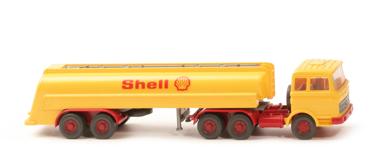 | Zugmaschine | Typ | Dach querversteift | Kabine | gelb | Spiegel, Lenkrad | ohne | Verglasung | klar | Inneneinrichtung | ca. hellgelbgrau | Stoßstange | rot, Scheinwerfer ungesilbert | Chassis | rot | Halterung Pritsche | mit | Radlauf hinten | einteilig rot | Reserverad | hinter Kabine | Räder | Profil grob | Felgen | hellbraunrot | | Auflieger | Farbe | gelb | Leiter | nicht gesilbert | Farbe Chassis, Armaturen | silber | Beschriftung Seite | SHELL gemischt mit Muschel | Beschriftung Art | Abziehbild | Beschriftung Heck | neues Logo Muschel | Beschriftung Art | Abziehbild groß | DAA Farbe | rot | DAA Typ | Klemmplatte | Bodenprägung Chassis | nur Wiking | Königsbolzen | groß | Reserverad | gesteckt | Räder | Profil grob | Felgen | hellbraunrot |