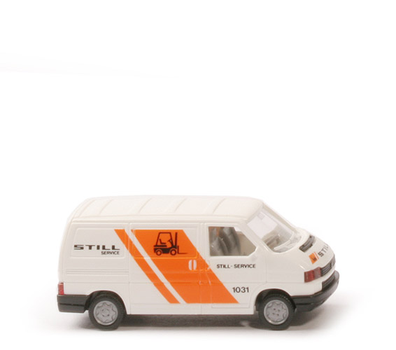 Farbe Karosserie | weiß | Grill und Lüftergitter | schwarz eingesetzt | Tür hinten | Türen 2-teilig | Scheinwerfer | klar, eingesetzt | Blinker vorne | rot transparent, eingesetzt | Rückleuchten | rot transparent, eingesetzt | Verglasung | klar | Inneneinrichtung | Sitze nur eine Reihe, Lkr separiert | Farbe Inneneinrichtung | ca. lichtgrau | Chassis Farbe | ca. lichtgrau | Bodenprägung | neues Wiking-Logo, VW T 4, Germany | Beschriftung Front | Logo, "Still" | Beschriftung Seiten | "Still Service", Stapler - (s. Foto) | Beschriftung Türen | "Still Service, 1031" - (s. Foto) | Beschriftung Heck | 2x "Still" | weitere Bedruckung vorne | VW Emblem silbern | Räder | aufgezogene Reifen | Felgen | silbern |