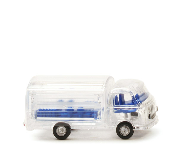 Kabine | klar transparent | Verglasung | klar transparent | Inneneinrichtung | dunkles signalblau | Bedruckung | Scheinwerfer silbern, Borgward-Grill silbern/ schwarz | Chassis | klar transparent | Zughaken | integriert | Aufbau | klar transparent | Rolltüren | klar transparent | Auslagen | dunkles signalblau | Tresenkante, Innenbereich | klar transparent | Bedruckung Rückleuchten | rot | Druck Rückseite | weiße Kanne auf blauem Grund | Räder | 8 mm, anthrazit | Felgen | klar transparent |