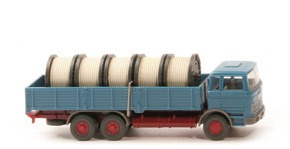 | Fahrzeug | Kabine oben | azurblau | Kabine unten | azurblau | Streifen | ohne | Verglasung | klar | Inneneinrichtung | ca. hellolivgrau | Lenkrad | mit | Stoßstange, Radlauf vorn | basaltgrau, Scheinwerfer ungesilbert | Chassisfarbe | weinrot | Radlauf hinten | basaltgrau, 1-teilig | Reserverad | unter Chassis gesteckt | Pritsche | azurblau | Pritscheneinlage | lichtgrau | Räder | 12mm, Profil grob | Felgen | hellbraunrot | | Kabel | Halterung | Metallklammer | Prägung | Nordkabel | Kabelrolle | anthrazit | Kabel | weiß (etwas vergilbt) |