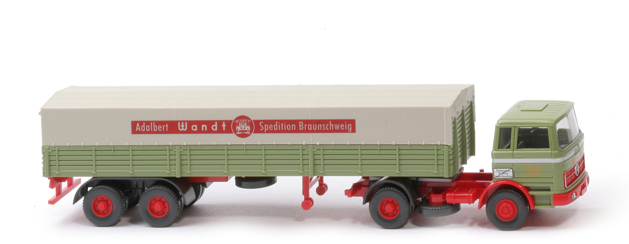 | Zugmaschine | Kabine oben | helles resedagrün | Kabine unten | helles resedagrün | Streifen | silbern | Verglasung | klar | Inneneinrichtung | ca. anthrazit, Lkr. integriert | Grill | rot, großer Stern, Umrandung, Stern, Zierlinien silber | Druck Front | "Wandt" | Druck Türen | Standortschild und "Wandt" mit Adressangabe | Stoßstange, Radlauf vorn | rot | Chassistyp | neu, BP neues WIKING-Logo | Chassisfarbe | rot | Radlauf hinten | rot | Reserverad | unter Chassis | Sattelpfanne | für großen Königsbolzen | Räder | 12mm, Profil grob | Felgen | 8-Loch, rot | | Auflieger | Farbe Pritsche | helles resedagrün | Pritschentyp | 3-teilig, Neuauflage | Chassis | mit Unterfahrschutz | Pritscheneinlage | silbern | DAA | Kotflügel rund, Klipsachsen, rot | Königsbolzen | stark | Plane Farbe | ca. hellolivgrau | Plane Druck | "Adalbert Wandt, ... " | Räder | 12mm, Profil grob | Felgen | 8-Loch, rot |