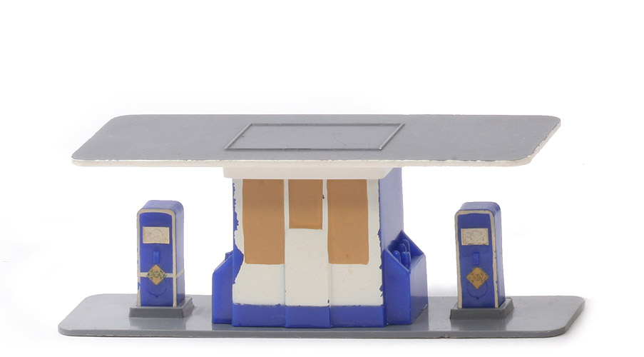 Im GK nicht gelistet. Offenbar frühes Werbemodell für Aral mit BV-Nassschiebern auf den Zapfsäulen. Diese Version mit nach hinten hohlen Zapfsäulen datiert der GK auf 1952 bis 1954. Das angeblich mit dieser Tankstelle im Set abgegebene Modell des White-Aral-Tanksattelzuges wird in den Katalogen auf 1951 datiert. |