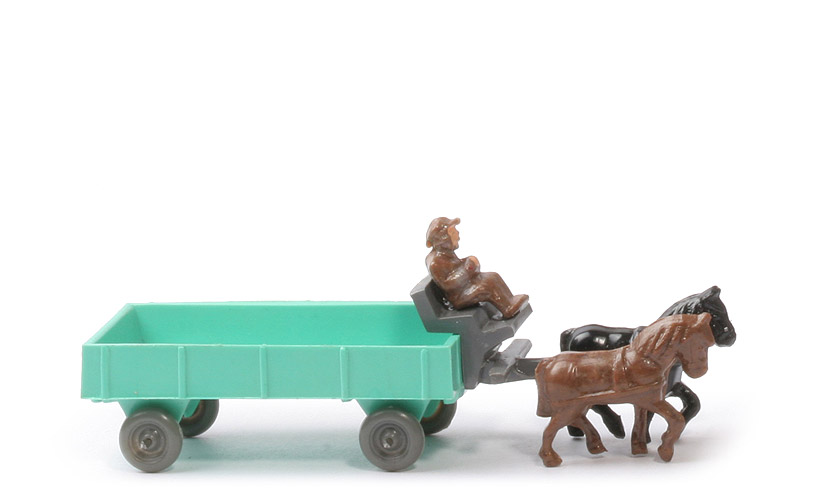 Räder | Drahtachser | Pritschentyp | ohne Querverbretterung | Farbe Pritsche | leuchtgrün | Deichselrest | mit | Pritschenboden | mit Struktur | Zughaken | integriert, nach unten | Deichsel/Kutschbock | ca. dunkelbasaltgrau | Quersteg Deichsel | mit | Farbe linkes Pferd | schwarz | Farbe rechtes Pferd | dunkles lehmbraun, leicht meliert | Kutscher Typ | Mütze | Kutscher Farbe | dunkles lehmbraun, leicht meliert | Kutscher Bemalung | Gesicht, Hände | Räder | transparentes staubgrau |