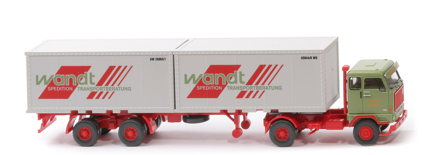| Zugmaschine | Kabine oben | helles resedagrün | Sonnenblende | helles resedagrün, Druck "Adalbert Wandt" | Dachgepäckträger | ohne | Leiter Fahrerseite | ohne | Luftansaugstutzen | rot | Verglasung | klar | Inneneinrichtung | ca. anthrazit | eingesetzter Grill | breit, rot, Rand und Logo silbern bedruckt | Bedruckung Front | "Volvo", Scheinwerfer silbern, Scheibenwischer schwarz | Bedruckung Seiten | s. Kommentar | Kabine unten | helles resedagrün | Stoßstange | rot | Chassis | rot | Kardaneinsatz | rot | Bodenprägung | neues WIKING-Logo | Sattelpfanne | schmal, mit Griff | | Container | Typ | 2x 20 ft Plywood | Farbe | helles grau | Bedruckung Seiten Cont. 1 | "Wandt, Spedition, ...", Cont-Nr. 03044/9 WG | Bedruckung Seiten Cont. 2 | "Wandt, Spedition, ...", Cont-Nr. GW 26065/1 | | Auflieger | Farbe | rot | Unterfahrschutz | mit | Bodenprägung | neues WIKING-Logo | | Räder | Typ | 12 mm, Felgen eingesetzt | Felgen | 8-Loch, rot |