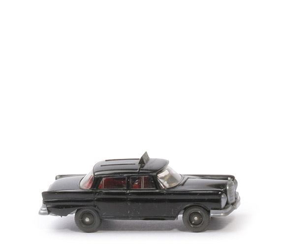 Farbe Karosserie | schwarz | Taxi-Schild | Teil des Daches | Taxi-Schrift | Abziehbild gelbgrün | Verglasung | klar | Grill | silbern, eingesetzt, mit Stern | Scheinwerfer | silbern, separat eingesetzt | Inneneinrichtung | rot | Lenkrad | separat eingesetzt, ca. hellelfenbein | Chassis Farbe | silbern | Bodenprägung | Mercedes 220 S, Wiking Germany, WM | Zughaken | ohne | Bemalung Rückleuchten | ohne | Räder | Riffelkappe anthrazit | Bemalung Felgen | ohne |