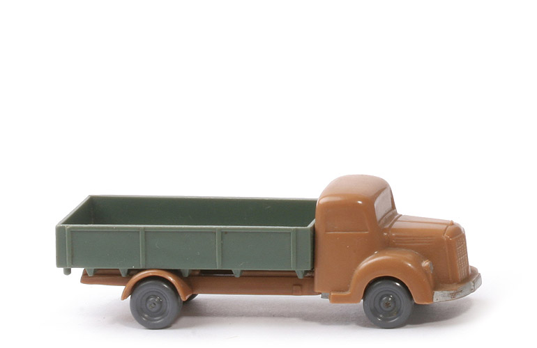 Achsen | Rollachser | Farbe Kabine u. Chassis | ockerbraun | Kabinenboden | geschlossen | Bodenplatte Prägung | WM im Kreis | Bemalung Kabine | Scheinwerfer, Stoßstange | Pritsche | Seiten glatt | Farbe Pritsche | dunkelresedagrün | Zughaken | nach unten | Zapfen | Flachzapfen | Befestigung Pritsche | geklebt | Räder | 10 mm, ohne Profil, dunkelbasaltgrau |