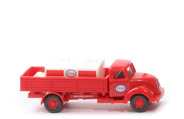 | Kabine | rot | | Verglasung | klar | | Inneneinrichtung | "schiefergrau", Lkr separat eingesetzt | | Bedruckung Scheinwerfer | silbern | | Bedruckung Grill | Umrandung, Logo silbern | | Bedruckung Blinker | ohne | | Bedruckung Stoßstange | "Magirus Deutz", silbern | | Bedruckung Türen | Esso-Logo | | Chassis Farbe | rot | | Chassis Art | Neuauflage ohne Zughaken | | Kupplung vorn | ohne | | mittlerer Chassisbereich | geschlossen | | Chassis Druck seitlich | "Magirus Deutz", silbern | | Chassis Bodenprägung | neues WIKING-Logo | | Zughaken | ohne | | Pritsche Art | neue Normpritsche, Verbretterung gerade | | Pritsche Farbe | rot | | Pritscheneinlage | ca. platingrau | | Bedruckung Rückleuchten | ohne | | Bedruckung Kennzeichen | ohne | | Audsetztank | weiß, Druck seitlich rote Balken, "Esso" | | Räder | 11 mm, zweiteilig | | Felgen | 6-Loch, rot |