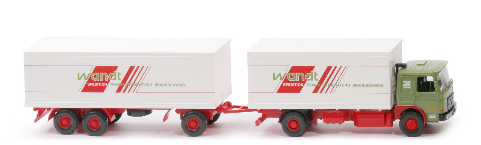 | Zugwagen | Kabine | helles resedagrün, Kotflügel hinten rot schabloniert | Verglasung | klar | Inneneinrichtung | Lenkrad integriert, ca. anthrazit | Spiegel | mit | Scheibenwischer | mit | Dachlüfter | hoch | Grill | schwarz, Umrandung, "MAN", Logo gesilbert | Frontdruck | "Adalbert Wandt", Blinker orange | Druck Seite | "Wandt", Logo, Standortschild | Kabine unten, Stoßstange | schwarz | Scheinwerfer | silbern bedruckt | weitere Bedruckung Stoßstange | "T.I.R." Negativdruck blau auf weiß | Koffer | weiß | hier Bedruckung | "Wandt, Spedition, Transportberatung Braunschweig"" | Radlauf hinten | schwarz | | Anhänger | Koffer | weiß | hier Bedruckung | "Wandt, Spedition, Transportberatung Braunschweig"" | Chassis, DAA | rot | Drehschemel, Deichsel | rot | Reseverad | unter Chassis | | Räder | Farbe | anthrazit | Felgen | rot |