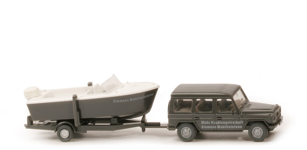 | Zugwagen | Farbe Karosserie | anthrazit | Hecktür | 1-teilig | Reserverad | an der Hecktür, Position: bis Hecktürkante | Grill | Teil des Chassis | Verglasung | klar | Dach | separat aufgesetzt | Inneneinrichtung | ca. graubeige | Chassis Farbe | anthrazit | Bodenprägung | WIKING - Berlin-W | Zughaken | mit, Mikro-Ausführung | Druck Fahrerseite | "Mehr Handlungsfreiheit", "Siemens Mobiltelefone" | Druck Beifahrerseite | "Mehr Handlungsfreiheit", "Siemens Mobiltelefone" | Räder | 9 mm, 2-teilig | Radkappen | silbern | | Boot | Bootoberseite | weiß | Vordersitze | mit Verbindungssteg mit Nippel | Windschutzscheibe | flach (ca. 6 mm hoch) | Lenkrad | anthrazit, 3-speichig | Fußraum (Deck) | anthrazit | hier Prägung | WM | Außenborder | weiß (etwas vergilbt) | Rumpf | anthrazit, Druck "Siemens Mobiltelefone" | | Anhänger | Farbe | anthrazit | Version | Typ 3 (lange Deichsel - kleine Öse) | Nestkennung | "1" | Bodenprägung | Wiking Germany | Befestigung Boot | per Kunststoffhalterung - anthrazit | Räder | Riffelkappe, gesilbert |