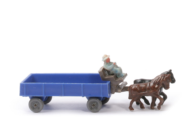 Räder | Drahtachser | Pritschentyp | ohne Querverbretterung | Farbe Pritsche | ultramarin | Deichselrest | mit | Pritschenboden | mit Struktur | Zughaken | integriert, nach unten | Deichsel/Kutschbock | ca. blassbraun meliert | Quersteg Deichsel | mit | Farbe linkes Pferd | schwarz | Farbe rechtes Pferd | ca. schokobraun, meliert | Kutscher Typ | Hut | Kutscher Farbe | hellblau-hellelfenbein misch | Kutscher Bemalung | Gesicht, Hände | Räder | ca. staubgrau |