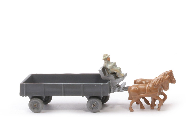 Räder | Drahtachser | Pritschentyp | ohne Querverbretterung | Farbe Pritsche | basaltgrau | Deichselrest | ohne | Pritschenboden | mit Struktur | Zughaken | integriert, nach unten | Deichsel/Kutschbock | silbern | Quersteg Deichsel | mit | Farbe linkes Pferd | ockerbraun | Farbe rechtes Pferd | ockerbraun | Kutscher Typ | Hut | Kutscher Farbe | papyrusweiß Mischtöne | Kutscher Bemalung | Gesicht, Hände | Räder | ca. staubgrau |