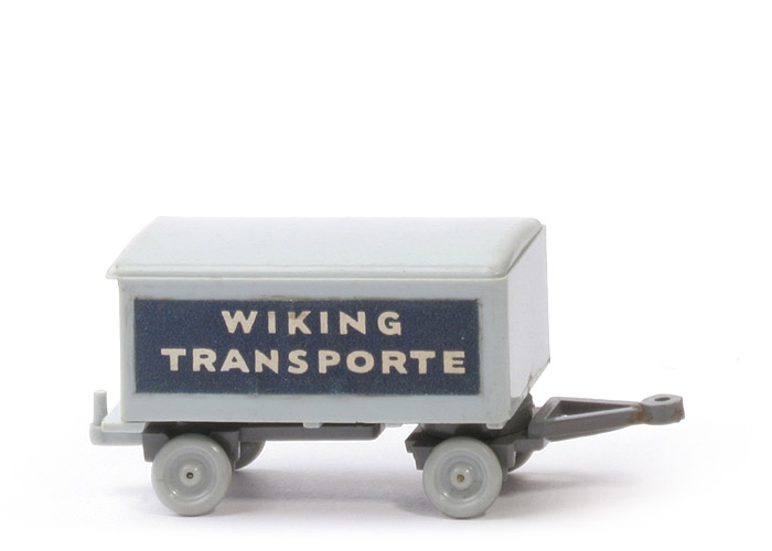 Koffer Typ | flacher Koffer Typ 1a | Türaufnahmen unten | geschlossen | Dach | Teil des Aufbaus | Boden | mit integriertem Zughaken | Rückleuchten | ohne | Farbe Aufbau | silbergrau | Farbe Kofferboden | silbergrau | Farbe Türen | silbergau | Türgriff | als Knopf | Chassis Farbe | basaltgrau | Achshalterungen | geschlossen | Drehschemel | vernietet | Deichsel | starr, Teil des Drehschemels | Beschriftung | Wiking Transporte (s. Foto) | Beschriftung Art | Papieraufkleber | Beschriftung Farbe | stahlblau/weiß | Bemalung Nummernschild | silbern | Räder | sog. Porzellanräder |