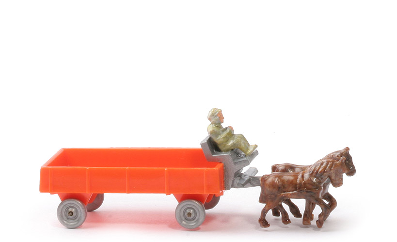 Räder | Drahtachser | Pritschentyp | ohne Querverbretterung | Farbe Pritsche | helles leuchtorange | Deichselrest | mit | Pritschenboden | glatt | Zughaken | ohne | Deichsel/Kutschbock | silbern | Quersteg Deichsel | mit | Farbe linkes Pferd | ca. lehmbraun meliert | Farbe rechtes Pferd | ca. lehmbraun meliert | Kutscher Typ | Mütze | Kutscher Farbe | misch schilfgrün - lindgrün | Kutscher Bemalung | Gesicht, Hände | Räder | silbern |