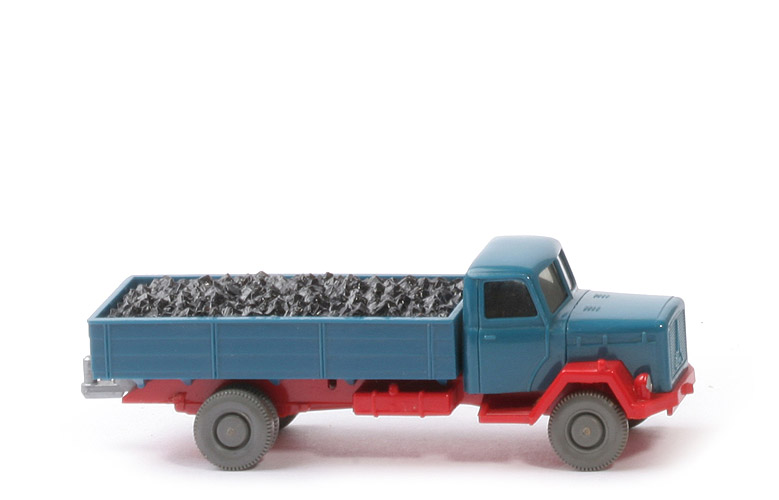 Farbe Kabine | azurblau | Verglasung | getönt | Bemalung vorn | Scheinwerfer silber | Chassis Farbe | rot | Chassis Art | Version 4 | hinterer Chassisbereich | geschlossen | Chassis Bodenprägung | WM, Germany | Pritsche Art | Normpritsche | Pritschenseiten | waagerechte Gravuren | Rückleuchten | bündig an Rückwand | Kennzeichen | einteilig | Pritsche Farbe | azurblau | Pritscheneinlage | silbern | Bemalung Rückleuchten | rot | Bemalung Kennzeichen | ohne | Zughaken | silbern, eingesetzt | Ladung | Kohlenladung, schwarz, grobe Stuktur | Räder | 11mm, glatt, hellgrau |