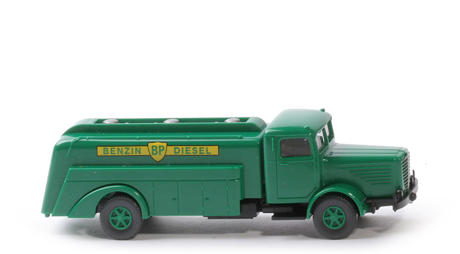 Kabine | dunkelgrün | Verglasung | klar | Inneneinrichtung | ca. basaltgrau | Scheinwerfer | gesilbert | Grill | gesilbert | Beschriftung Türen | ohne | Kotflügel vorne | dunkelgrün | Chassis Farbe | schwarz | Bodenprägung | neues WIKING-Logo, Berlin-W, Germany | Tankaufbau | dunkelgrün | Bedruckung Tank Seite | Benzin, BP, Diesel | Bedruckung Tank Heck | ohne | Füllanlage | silbern | Kotflügel hinten | dunkelgrün | Räder | 12 mm Profil grob | Felgen | Trilex, dunkelgrün |