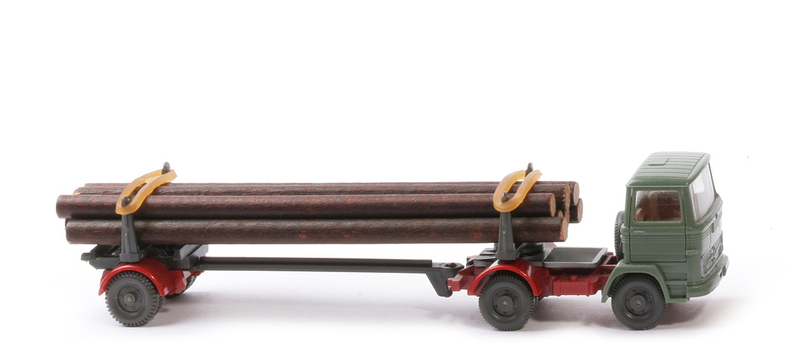 | Zugmaschine | Farbe Kabine | dunkelresedagrün | Spiegel | ohne | Verglasung | klar | Inneneinrichtung | ca. olivgrau | Lenkrad | ohne | Grill | eingesetzt, silbern mit Stern | Reserverad | hinter Kabine | Farbe Chassis | weinrot | Sattelpfanne | für großen Königsbolzen | Radlauf hinten | weinrot | Zughaken | einfach | Räder | 11mm, einteilig, Profil fein | | Auflieger | Rungen | anthrazit | Deichsel | anthrazit | Gestaltung Deichsel | Zughaken übergreifend | Radlauf | weinrot | Königsbolzen | stark | Ladung | 7 Rundhölzer, dunkel | Befestigung der Ladung | Gummibänder | Räder | 11mm, einteilig, Profil grob |