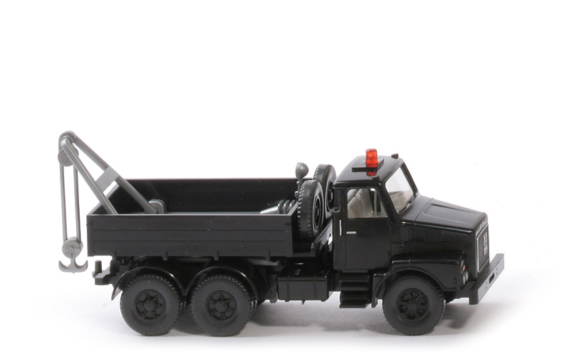 | Kabine | schwarz | | Warnlicht | orangetransparent, auf Sockel | | Verglasung | klar | | Inneneinrichtung | ca. lichtgrau, Lkr integriert | | eingesetzter Grill | schwarz, Umrandung, Lgo silbern | | Scheinwerfer | gesilbert | | Trittstufen | schwarz | | Chassis | schwarz | | Kardaneinsatz | schwarz | | Bodenprägung | neues WIKING-Logo | | Radlauf hinten | 2-teilig, schwarz | | Tank | unten geschlossen | | Sattelpfanne | für großen KöBo | | Zughaken | am Chassis | | Pritsche | schwarz | | Pritscheneinlage | silbern, mit integrierten Werkzeugen | | Arbeitsscheinwerfer | silbern | | Krangestell | silbern | | Kranhaken | silbern | | Reserveräder | 2 vor der Pritsche | | Räder | 12 mm, Felgen eingesetzt | | Felgen | Trilex neu, schwarz |