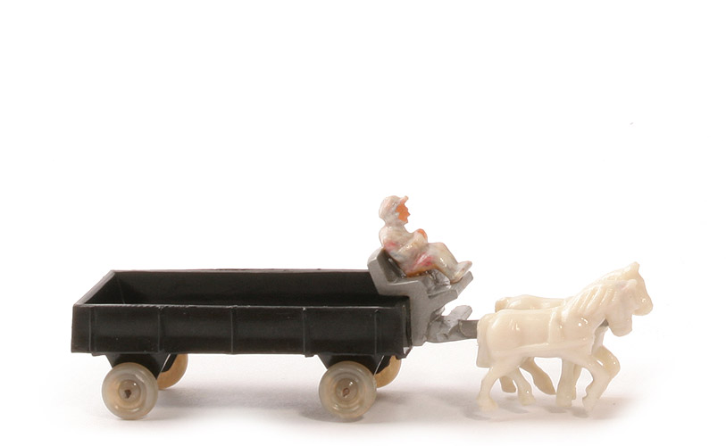 Räder | Drahtachser | Pritschentyp | ohne Querverbretterung | Farbe Pritsche | schwarz | Deichselrest | mit | Pritschenboden | glatt | Zughaken | ohne | Deichsel/Kutschbock | silbern | Quersteg Deichsel | mit | Farbe linkes Pferd | weiß | Farbe rechtes Pferd | weiß | Kutscher Typ | Mütze | Kutscher Farbe | ca. misch hellgrau | Kutscher Bemalung | Gesicht, Hände | Räder | glasig |